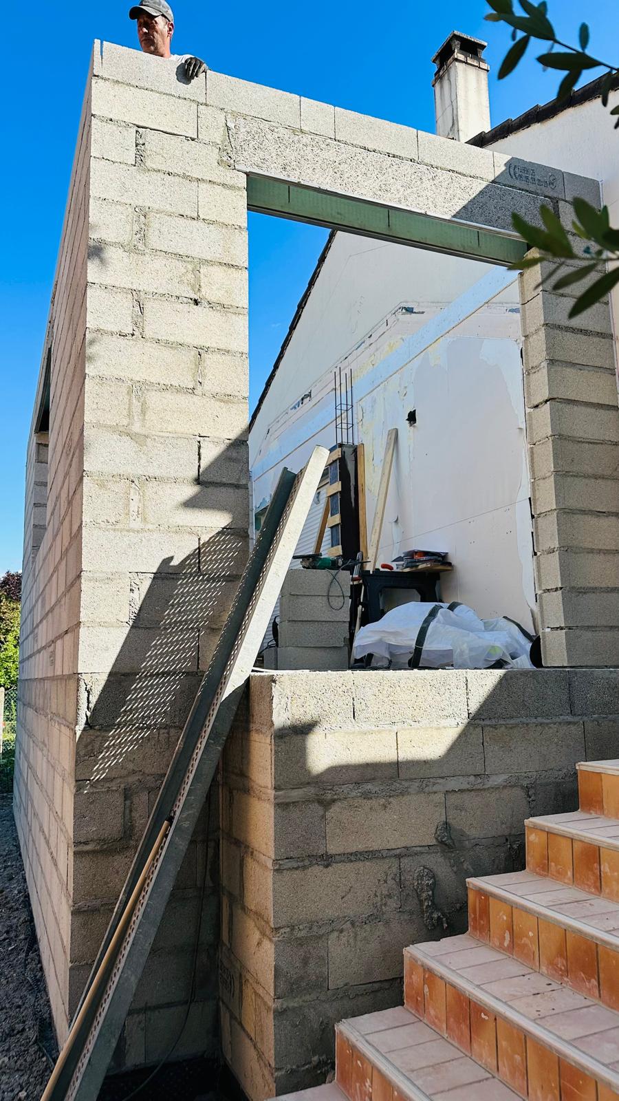 Après les fondations, les travaux de maçonnerie ont permis de donner forme à la structure de l’extension. Les murs ont été réalisés avec soin, afin d’assurer une continuité structurelle et esthétique avec la maison existante. La charpente et la couverture sont venues compléter l’élévation, garantissant la solidité de l’ensemble et la protection du bâti.