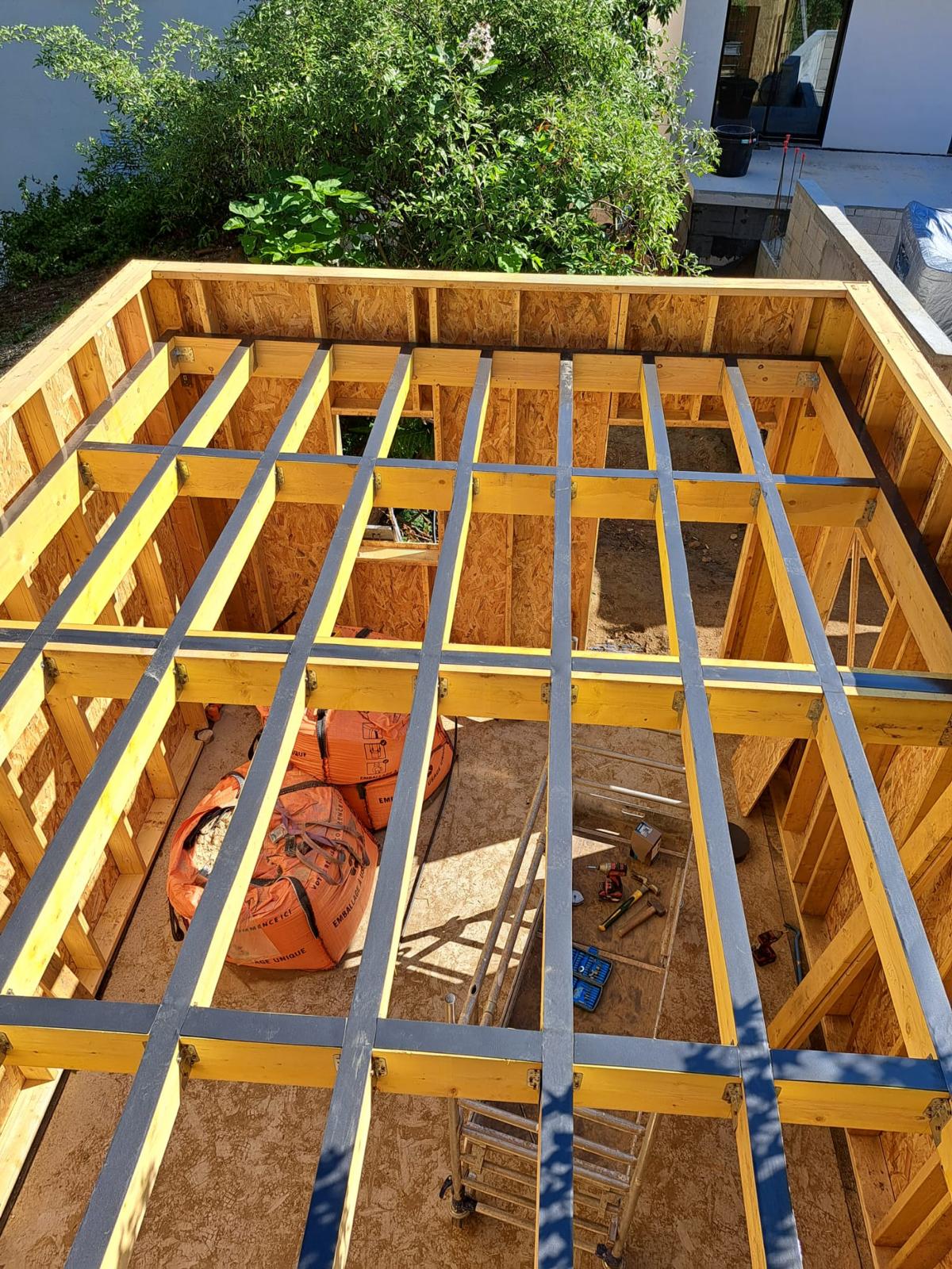 Dans le jardin, une cabane de 24 m² a été réalisée afin de créer un espace polyvalent. Cet ouvrage peut accueillir du rangement, des loisirs ou évoluer vers d’autres usages selon les besoins des occupants.