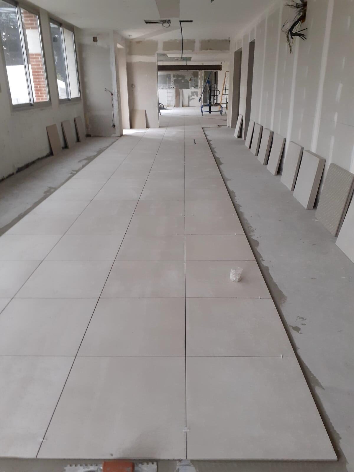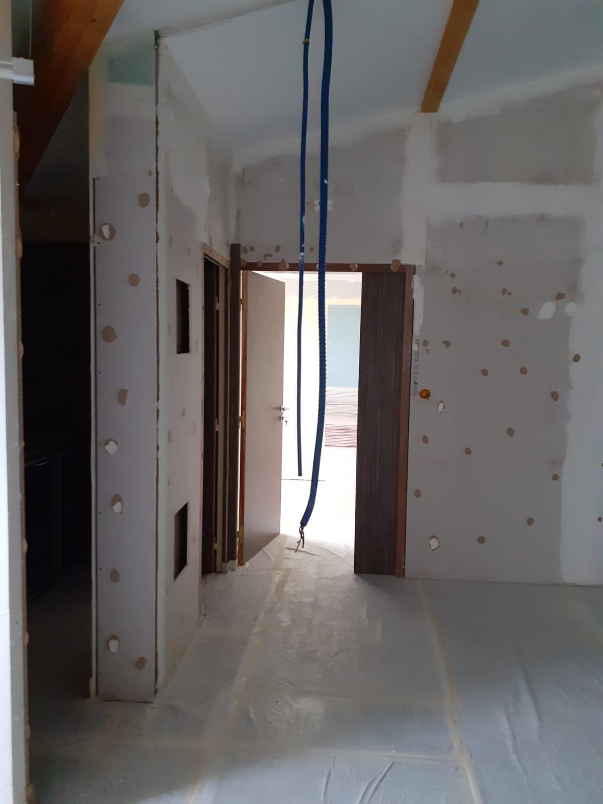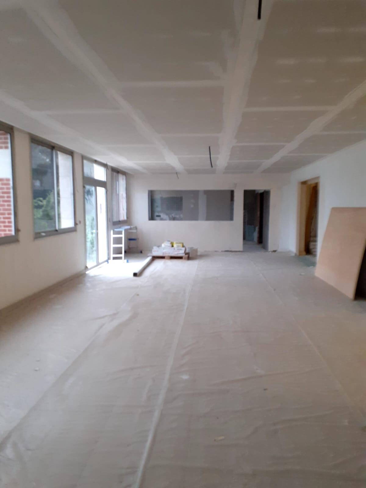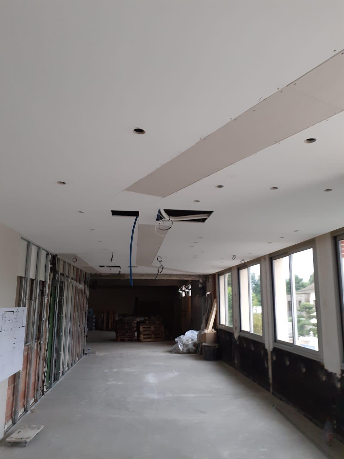 Les travaux de second œuvre ont joué un rôle central dans la transformation du bâtiment. La mise en œuvre de cloisons en placo a permis de redéfinir les volumes et d’optimiser l’agencement des espaces. Les revêtements de sols en carrelage ont été posés afin d’assurer durabilité, facilité d’entretien et cohérence esthétique.