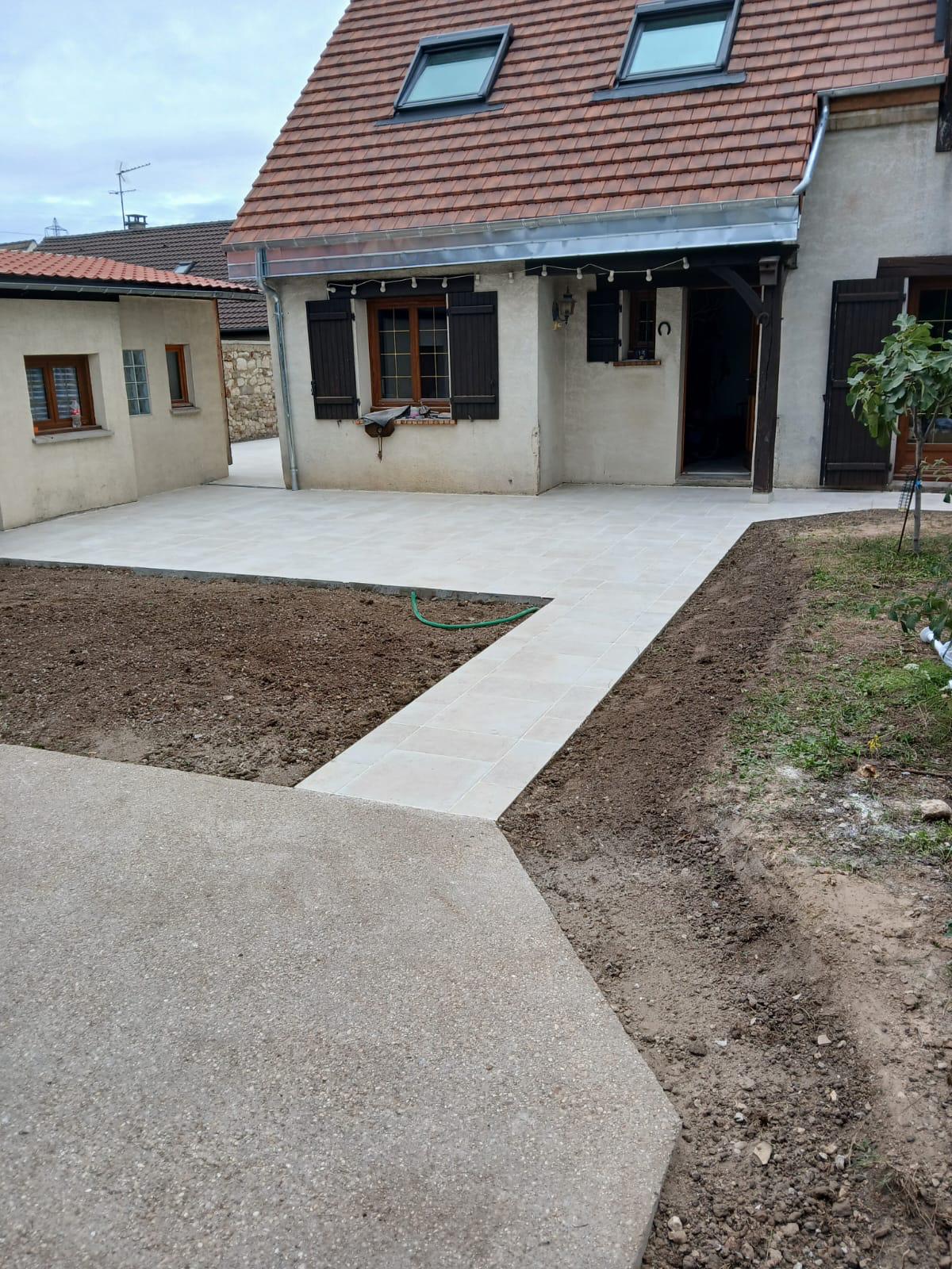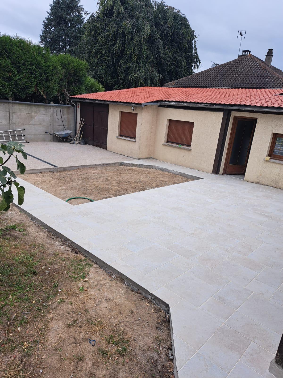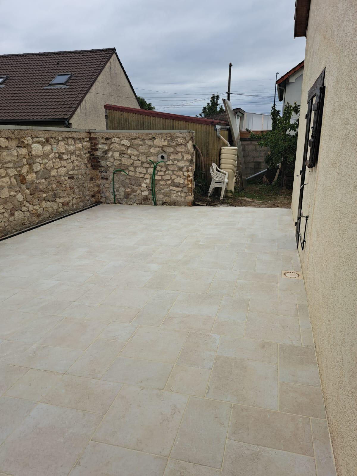 Une fois la dalle béton réalisée, ESRM a procédé à la pose d’un carrelage extérieur. Ce revêtement permet de transformer la terrasse en un espace à la fois esthétique, facile d’entretien et résistant. Le carrelage apporte également une finition soignée, contribuant à la valorisation de l’ensemble de la maison.